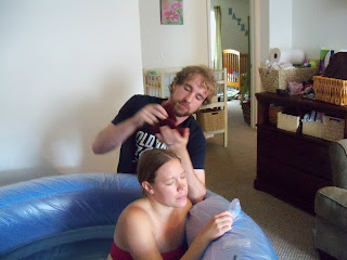 Early on July 4, Nathan woke up crying, so I went into his room and noticed I was feeling that crampy, weird, not quite normal feeling that indicated the onset of labor with my other pregnancies. It was about 3:30 am, and I knew I’d be able to go back to sleep, so I went to bed. Around 6:30, my contractions were about 5 minutes apart, but not very painful and I was still able to sleep through them. I still texted my midwives to let them know I thought this was the real deal. About half an hour later, I got up and ate a little, but found that I was really tired, so I went back to bed. My midwives arrived around 8, and I was sleeping somewhat fitfully, waking up about every 5 minutes to a contraction that was intense, but I was able to breath through it. Heidi came in and asked if she could check me and found that I was 7 cm dilated. After that I couldn’t sleep much, so I got up and started to wander around. Jesse ran Owen and Nathan over to Justin & Zoe’s and then came back and started filling up the birth tub for me.