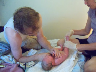 I leaned against the squishy side of the tub, kind of on my side, upright, one leg down against the bottom of the tub, the other knee up. Jesse was there with his arms around me, supporting me, my head on his upper arm and shoulder, giving me strength simply with his strong hold and presence. After a few contractions, when I could feel her head close, I took a deep breath and bore down on the next contraction. To everyone’s surprise and my great relief, her head came out! After Maureen checked to make sure the cord wasn’t around her neck, a few more little pushes, and out came her slimey little body into the warm water. Maureen lifted her out and handed her to me, then wrapped her with a warm towel. I wanted so badly to look at her sweet face and tell her how glad I was that she was here and how much I loved her. But my arms felt like jelly and all I could manage to do was put my head back, close my eyes, and savor the feeling of my little girl in my arms at last.